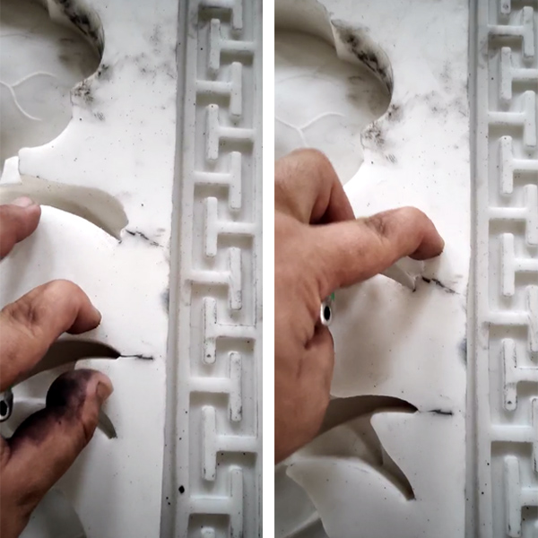 前幾天有個(gè)客戶發(fā)過來一段視頻是硅橡膠模具出現(xiàn)裂痕,而且情況十分嚴(yán)重(如下視頻截圖)。從圖片中看出該硅橡膠模具使用時(shí)間并不長,但是在模具邊角位出現(xiàn)一道道裂痕,大大影響生產(chǎn)。客戶告訴我們?cè)摴柘鹉z模具是從別家供應(yīng)商購買液體模具硅膠自行制作,投產(chǎn)使用不到一個(gè)月,日常使用3-5次左右,估算翻模次數(shù)在160次左右就出現(xiàn)這種情況。那么是什么原因?qū)е鹿柘鹉z模具出現(xiàn)裂痕?